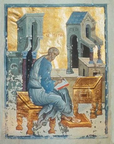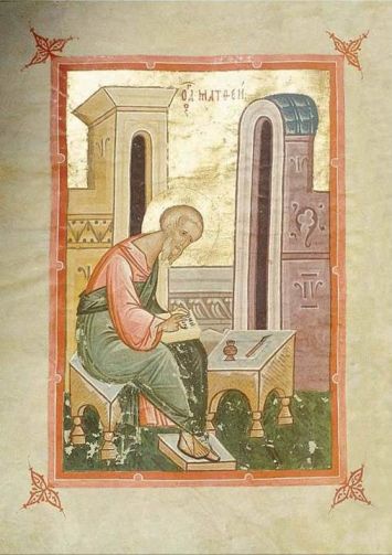 399. Мастер Даниил (?). Евангелист Матфей. Миниатюра Евангелия Хитрово. Около 1400 г. РГБ, ф. 304., Троицк, III, № 3 (М. 8657)