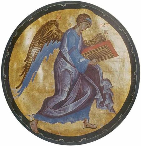 400. Мастер Даниил (?). Ангел – символ Евангелиста Матфея. Миниатюра Евангелия Хитрово. Около 1400 г. РГБ, ф. 304., Троицк., III, № 3 (М. 8657)