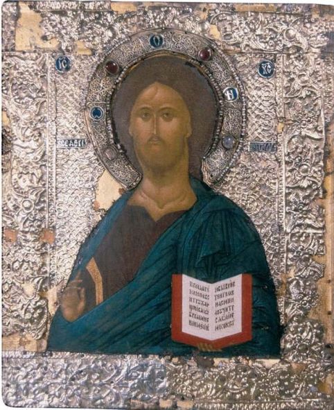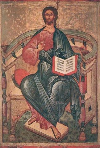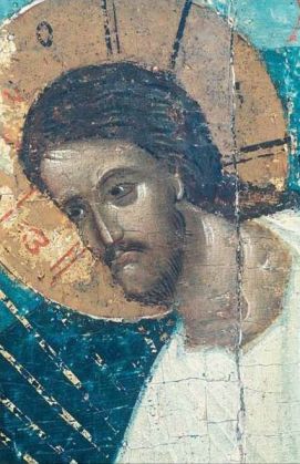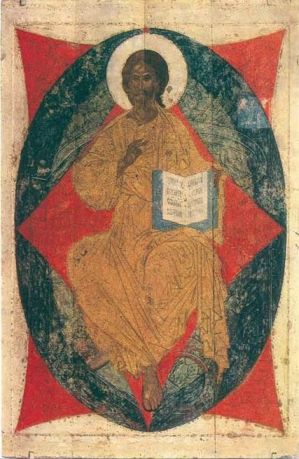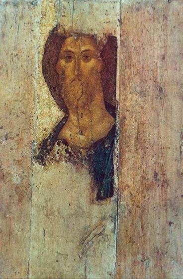 401. Андрей Рублев. Спас Вседержитель, из деисусного чина. Начало XV в. Из Успенского собора на Городке в Звенигороде. ГТГ