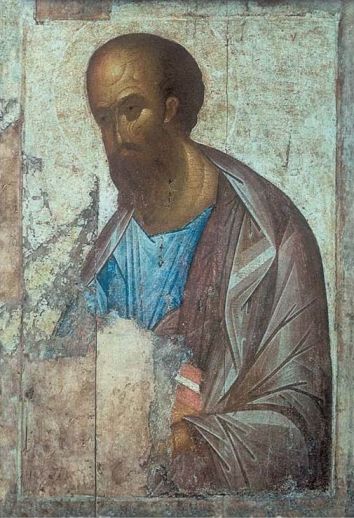 403. Андрей Рублев. Апостол Павел, из деисусного чина. Начало XV в. Из Успенского собора на Городке в 3венигороде. ГТГ