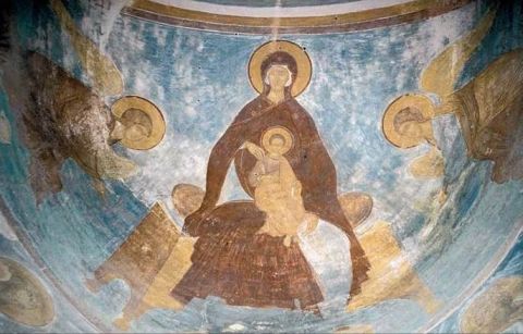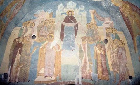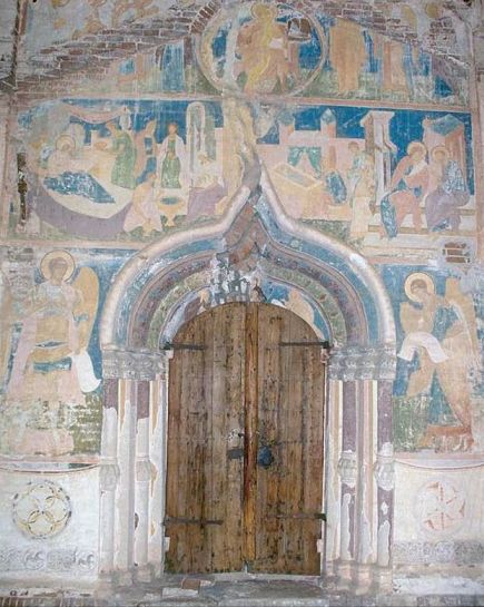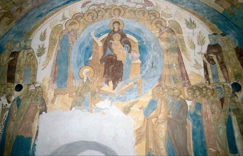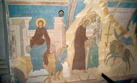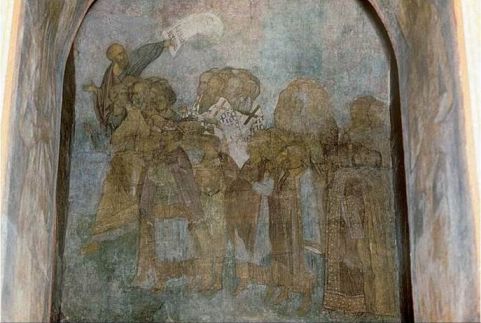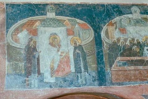 538. Сказание о явлении Богоматери скомороху. Фреска церкви Успения в Мелетове. 1465 г.