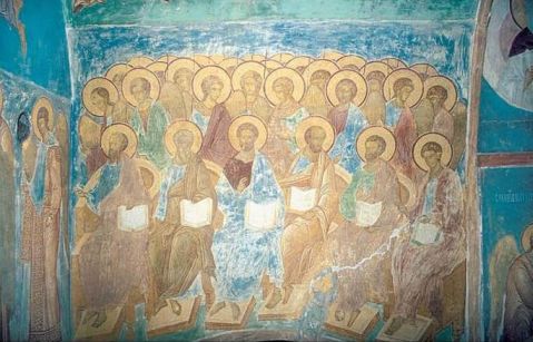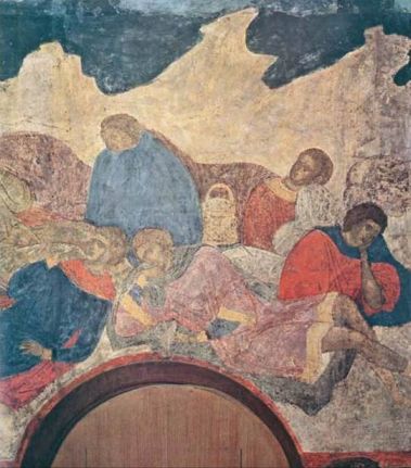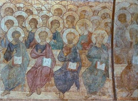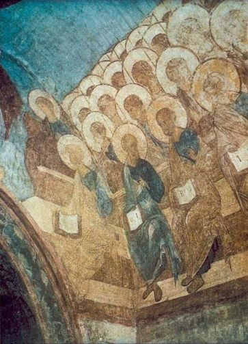 410. Андрей Рублев. Апостолы и ангелы из «Страшного Суда». Фреска Успенского собора во Владимире. 1408 г.