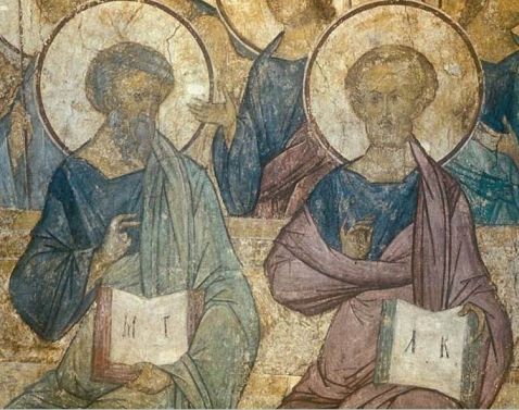411. Андрей Рублев. Апостолы Матфей и Лука из «Страшного Суда». Фреска Успенского собора во Владимире. 1408 г.