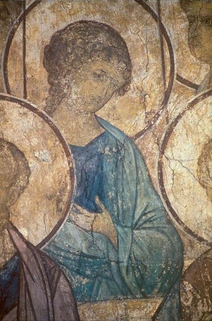 Единение ангелов подчеркивается и одинаковостью размеров фигур, и ритмическим сходством силуэтов, и специфическим рисунком, который создает ощущение плавного, медленного движения по кругу. Взгляд зрителя направляется от центрального ангела влево, в соответствии с наклоном его головы, и движется к левому ангелу, а далее, поднимаясь вдоль внешнего силуэта правого ангела, возвращается в исходную точку. Изобразительное решение, найденное Андреем Рублевым, как нельзя лучше отвечало стремлению православия выразить собственную концепцию христианского догмата, в противовес западной формуле «filioque». В XV в. ситуация с этим мотивом была особенно острой и напряженной, внимание к нему – особенно пристальным, поскольку ощущался натиск Римской Церкви, приведший к заключению Флорентийской унии 1439 г.