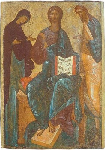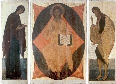 511. Спас на престоле, Богоматерь, Иоанн Предтеча. Центральная часть деисусного чина. Начало XV в. Из собрания И.С. Остроухова. ГТГ