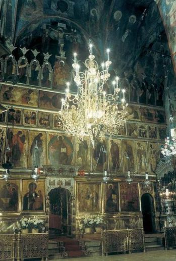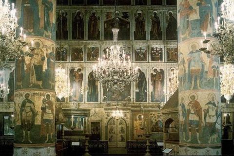 Совсем иной характер носит иконостас Успенского собора во Владимире. Это комплекс, в который входят самые большие из дошедших до нас русских икон (определенная огромными размерами домонгольского храма высота икон деисусного ряда – 3 м 14 см – повторяется только в иконостасе Успенского собора Московского Кремля, поскольку сам этот храм строился как подражание собору во Владимире). Ансамбль выделяется и количеством икон. У него появляется, кроме местного, деисусного и праздничного ярусов, еще и верхний ряд – пророческий, вводящий в ансамбль тему ветхозаветной истории человечества как прообразование истории новозаветной. В деисусный ряд включено рекордное для этого времени количество икон – 15: кроме центрального ядра, то есть Христа, Богоматери, Иоанна Предтечи и двух архангелов (илл. 418), это четыре апостола (не только Петр и Павел, но также Андрей и Иоанн Богослов), четыре святителя (наряду с Иоанном Златоустом, и Василием Великим, это Николай Мирликийский и Григорий Богослов), и, наконец, великомученики Георгий и Димитрий.