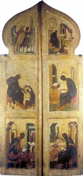 Иконография евангелистов с Премудростью, принесенная в Новгород из византийского или южнославянского искусства (возможно, через Афон), отвечала русскому стремлению наглядно передать возвышенность и боговдохновенность труда евангелистов (ср. фрагмент Царских врат из Твери, ГРМ). Евангелист Лука, хотя и изображен в рукописи Евангелия, пишет не книгу, а икону (известно предание, что он первый изобразил Богоматерь, застав Ее в живых). В иконописи ему тоже помогает Премудрость, как другим евангелистам в сочинении текстов: эта иконография является оригинальным творчеством новгородцев или использованием редкого, не дошедшего до нас византийского образца. Композиция подчеркивает божественное происхождение икон и доходчиво аргументирует справедливость догмата иконопочитания, оспаривавшегося сторонниками русских ересей конца XIV–XV вв.