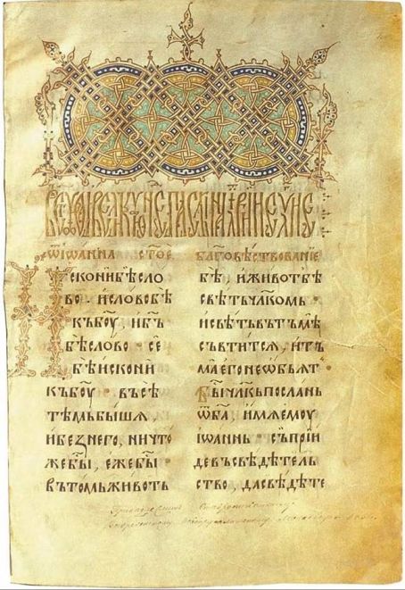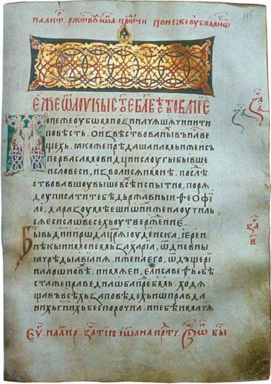 526. Начальный лист чтений на Пасху. Из Островского Евангелия. 1468 г. Московский областной краеведческий музей, Истра