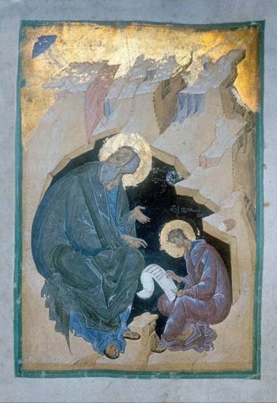 398. Евангелист Иоанн Богослов и Прохор. Миниатюра Евангелия Хитрово. Около 1400 г. РГБ, ф. 304., Троицк., III, №3 (М. 8657)