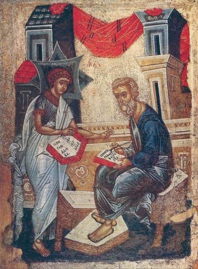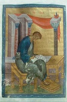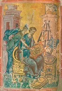 523. Евангелист Лука, с Софией Премудростью Божией, пишущий икону Богоматери. Миниатюра Рогожского Евангелия. Первая четверть XV в. РГБ, ф. 247 Рогожск, № 138