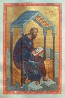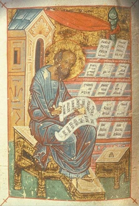 530. Апостол Павел, со своими сочинениями. Миниатюра Чертковского Апостола. Последняя четверть XV в. ГИМ, Чертк. 167