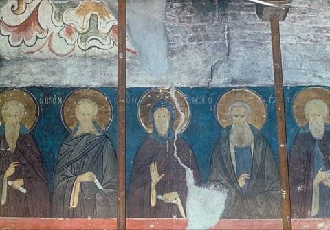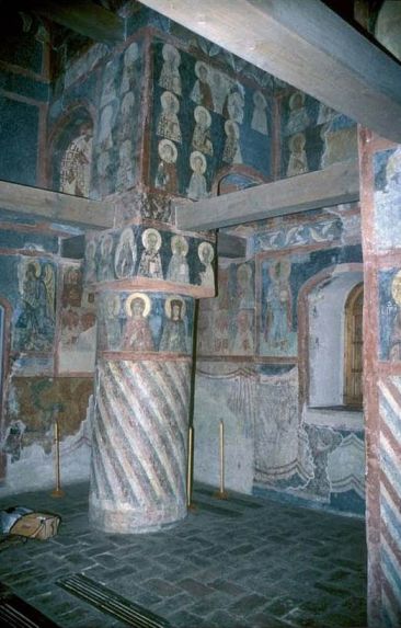 Если изображение св. целителей на предалтарных столбах имеет аналогии в древности (например, фрески 1125 г. в соборе Рождества Богородицы Антониева монастыря в Новгороде) и напоминает о том, что св. врачи исцеляют не только тела, но прежде всего людские души, то расположение монашеских сюжетов в нижнем регистре этих столбов исключительно своеобразно. Обе сцены прославляют монашеское житье, мудрость иноков. В одной сцене – иллюстрация предания о божественном, небесном происхождении монастырской жизни. Ангел, облаченный в монашеские одежды, с куколем на голове, поучает пустынника Пахомия, наставляя его, как гласит текст на свитке, покинуть отшельническую пещеру, собрать черноризцев и жить вместе. В другой сцене монах Варлаам привлекает к христианской вере юного индийского царевича Иоасафа, обращаясь к нему со словами, написанными на его свитке: «Поведаю тебе, чадо, о бисере бесценном, которым является Христос...». Слава монастырской жизни и величие монашеской проповеди – важная тема русской культуры в эпоху Средневековья, но никогда раньше подобные сюжеты не изображались на столь значительных местах храма, тем более что речь идет не о монастырской, а о городской церкви, находившейся под покровительством удельного князя. Во второй сцене есть и намек на конкретные исторические обстоятельства – на преданность князя Юрия своему духовному отцу – преподобному Савве Звенигородскому.