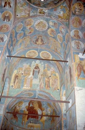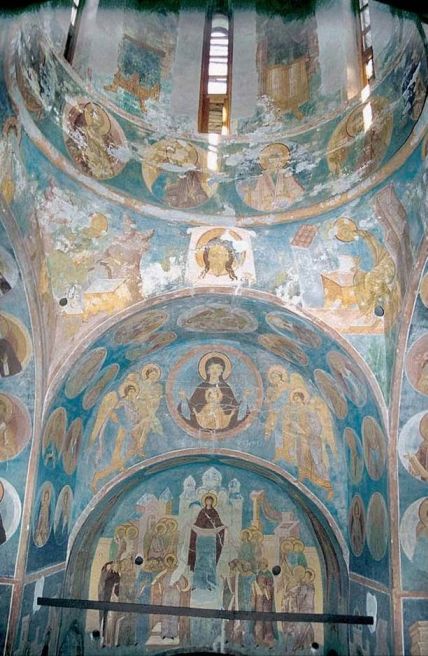 В появлении памятников нового стиля на Руси большую роль сыграли фрескисты, среди которых, возможно, были и приглашенные или «странствующие» художники из других стран православного мира. Роспись церкви Архангела Михаила в Сковородском монастыре, находившемся к юго-востоку от Новгорода, неподалеку от церкви Спаса на Нередице, была исполнена, как свидетельствуют детали иконографии и особенности стиля, около 1400 г., раскрыта из-под поздних поновлений в 1937–1938 гг., но погибла во время Великой Отечественной войны, когда был полностью разрушен сам храм, поэтому о ней приходится судить по фотографиям, цветным зарисовкам и копиям. В куполе был изображен Пантократор, в барабане – четыре архангела в рост и восемь пророков (опознаются Иеремия, Иоанн Предтеча, Иоиль, Иона). На арках находились фигуры ветхозаветных праведников и пророков, а в нижней части северной и южной подпружных арок, по сторонам алтаря – «Благовещение» с пророками Даниилом и Давидом. Сохранялись также композиции «Вознесение» над алтарной аркой, «Сошествие во ад» на восточной стене, «Воскрешение Лазаря» и «Вход в Иерусалим» на склонах свода западного рукава, а также ряд других композиций и фигур (евангелист Иоанн Богослов и свв. Борис и Глеб слева от алтарного проема, евангелисты Матфей и Лука – справа, где, видимо, был изображен и Марк).