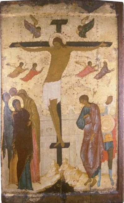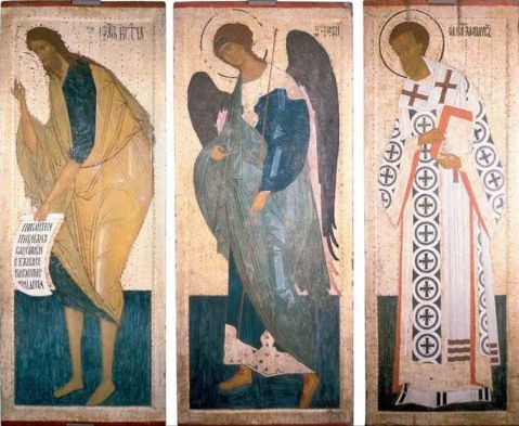 Узловым памятником московской живописи начала XV в. является Звенигородский чин (ГТГ). В деисусный ряд, кроме трех центральных изображений, двух архангелов и двух апостолов, входили также, возможно, иконы святителей Василия Великого и Иоанна Златоуста. Поскольку три иконы из этого ансамбля, с поясными изображениями Спаса, архангела Михаила и апостола Павла (илл. 389, 401–403) были найдены в 1918 г. в сарае около Успенского собора в Звенигороде, а доска от четвертой иконы, с поздним изображением Иоанна Предтечи, и сейчас находится в этом храме, то происхождение чина из звенигородского собора вряд ли удастся опровергнуть, как иногда пытаются.