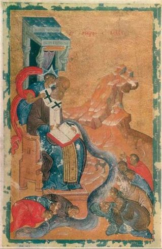 В Служебнике Вяжищского монастыря, около 1438–1441 гг., РНБ, Соф. 1537, хрупкость форм и душевная мягкость заявляют о себе еще более открыто (илл. 525). Св. Николай, изображенный в Служебнике не только в качестве великого совершителя литургии и почитаемого святого, но и в качестве патрона Вяжищского Никольского монастыря близ Новгорода, выглядит не как великий и прославленный епископ-чудотворец, а как добросердечный молитвенник, «печальник» за христиан. В его облике есть что-то народное, крестьянское. Тератологический орнамент этого Служебника для XV в. уже архаичен. Его выбор, видимо, отражает специфические вкусы заказчика (возможно, архиепископа Евфимия II) или мастеров.