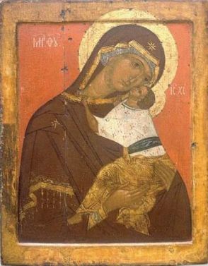 По необъяснимой причине, среди новгородских икон осталось относительно мало отдельных изображений Христа или Богоматери с Младенцем, которые должны были находиться в местном ряду иконостаса или на стенах храма, или просто среди коллекции небольших «пядниц», которые всегда находятся в храме как отдельный ряд или в качестве икон, сменяемых на аналое, или просто как памятные иконы для монастырских паломников. Подобные иконы в большом количестве присутствуют среди московского художественного наследия. Между немногими новгородскими иконами Богоматери иногда встречаются иконографические типы, в которых повторяются московские или ростовские образцы (илл. 497), но благодаря повышенной яркости цвета и стремительности контуров их интонация становится более энергичной, чем в иконах мастеров Центральной Руси.
