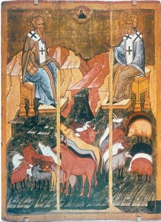 В новгородской иконописи получили распространение изображения некоторых святых в роли покровителей домашних животных. Нет сомнения, что в этом отразились особенности новгородского общества, с его большой долей крестьянства, населявшего обширные окрестные земли и северные территории. На иконе «Власий Севастийский и Спиридон Тримифунтский» из церкви Св. Власия в Новгороде (ГИМ, илл. 502) фон в верхней части был заменен на более поздний вместе с грунтом, и при этом, к сожалению, были частично срезаны очертания горок. Св. епископы изображены среди сияющих разноцветных скал, «в пейзаже», они словно беседуют друг с другом (новгородский вариант многочисленных изображений бесед в московской живописи XV в.). Животные, стоящие внизу, изображены так, что кажется, доброта христианских святых затрагивает бессловесные существа.
