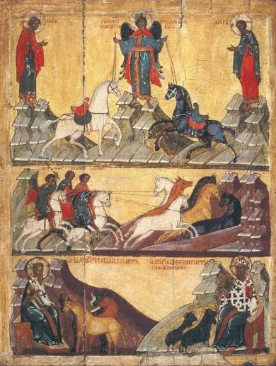В иконе «Чудо архангела Михаила о хлоре и Лавре», ГТГ, созданной, возможно уже в начале XVI в. и обнаруживающей характерное для этого периода воздействие изысканного московского искусства, сюжет и иконография имеют также древние и до сих пор не вполне ясные истоки. Фигуры архангела Михаила, который держит под уздцы двух разноцветных оседланных коней, и стоящих по сторонам Флора и Лавра напоминают античные композиции с юношами и конями, в том числе и Диоскуров. Византийских прототипов этой иконографии не сохранилось. На некоторый русских иконах имеется надпись: «Архангел Михаил поручает Флору и Лавру стадо коней». Внизу в таких иконах представлены всадники Спевсипп, Елевсипп и Мелевсипп, которые пасут большое стадо у водопоя (илл. 503).