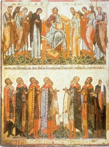 Творческий подход новгородских художников XV в. к сокровищнице византийско-русской иконографии сказался не только в сохранении и преобразовании очень древних и редких вариантов, в их наполнении новым смыслом, но и в рождении новых схем, отражающих реальную новгородскую действительность, в которых византийские прототипы звучат лишь отдаленно. В двухъярусной иконе 1467 г. «Деисусный чин и молящиеся новгородцы» (Новгородский музей, илл. 504) дана разновидность средневекового ктиторского портрета, но весьма своеобразная. Заказчик, богатый боярин Антипа Кузьмин, приказал изобразить членов своей семьи в молении перед Христом. Семеро взрослых, в богатых одеждах, представлены в виде внушительной изокефальной шеренги, с равномерно размещенными фигурами, напоминая в совокупности портрет знатной семьи феодалов, даже столь высокого ранга как сербские короли, чьи портреты сохранились в изобилии в сербских храмах XIII–XIV вв. Среди перечисленных семи имен не значится сам заказчик, из чего следует, что это те члены его семьи, которых уже нет в живых (в их числе – два маленьких ребенка, в белых одеждах, безымянные, то есть умершие во младенчестве).