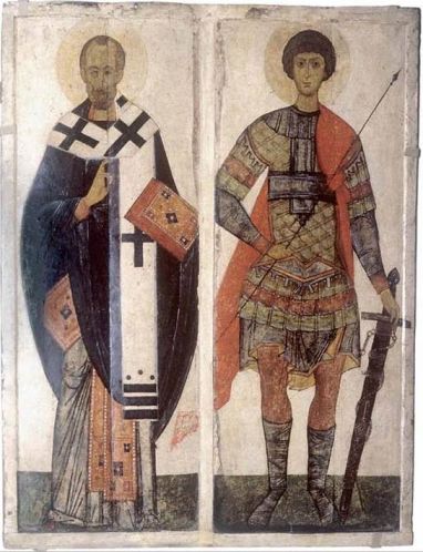 Повторены тип лика, форма рта, тонкая кисть руки и даже имитированы пышные складки. «Почвенная» традиция – в плотности композиции, яркости красного фона, стилизации линий, а главное – в патетическом характере образа, в героической осанке апостола, который похож на юного воина-мученика, например на св. Димитрия. Меньше конкретной местной окраски в иконе «Свв. Никола и Георгий» (ГРМ, илл. 507), которая имеет общие черты и с московскими произведениями, и со Сковородскими фресками – в изысканном, несколько манерном облике святых, особенно в позе и жесте св. Николы, в типе лика св. Георгия, в ритме эластичных дугообразных линий.