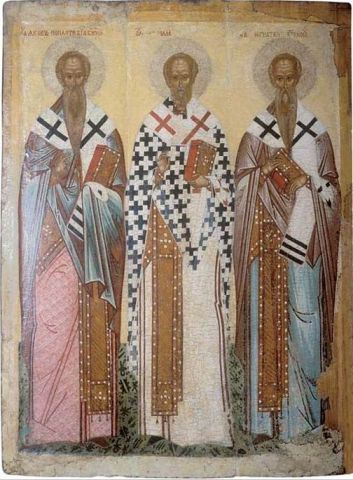 517. Свв. Кирилл и Афанасий Александрийские, Леонтий Ростовский. Конец XV в. Из Мало-Кириллова монастыря близ Новгорода. Новгородский музей