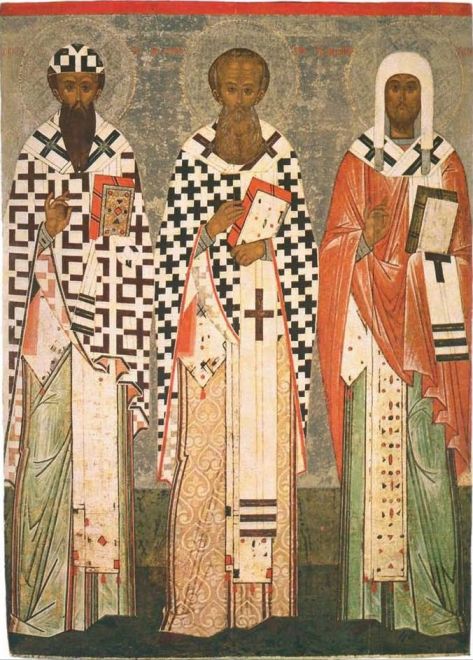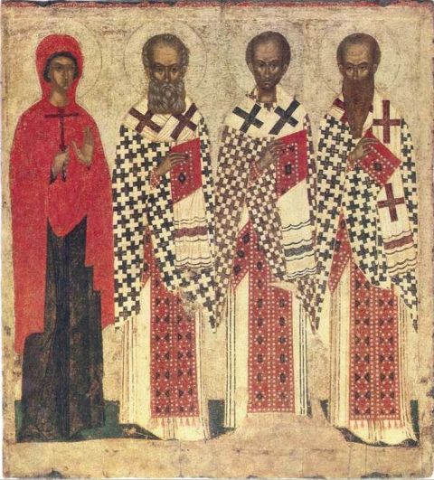 Существо произошедших в псковском искусстве перемен хорошо демонстрирует икона раннего XV столетия с изображением и трех вселенских святителей – Василия Великого, Иоанна Златоуста и Григория Богослова, и св. мученицы Параскевы Пятницы (ГТГ, илл. 532). Икона написана в подчеркнуто сдержанной цветовой гамме, что призвано выявить строгость образа. Лики святых с обостренными чертами, впалыми щеками анахоретов и горящими взглядами проповедников имеют акцентирована аскетичный вид, но их мистицизм не умозрителен, а активно направлен во вне, на зрителя, в мир. В иконе много реминисценций искусства позднего XIV века – лики по-прежнему обладают рельефной пластикой и проработаны активной линейной пробелкой, как будто призванной подчеркнуть эмоциональную приподнятость святых. Однако в целом образ оказывается более сдержанным, исполненным чуть иератичного достоинства и величия.