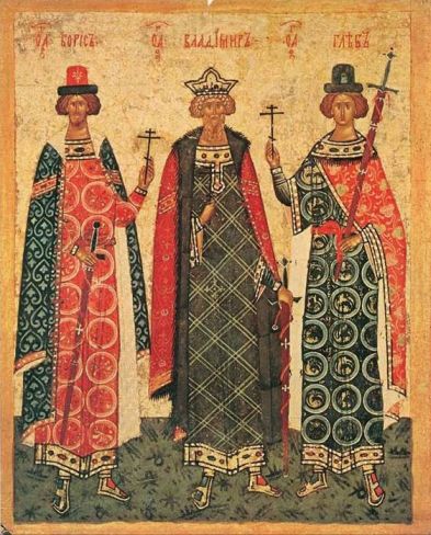 521. Свв. князья Владимир, Борис и Глеб. Софийская таблетка. Конец XV в. Музей-квартира П.Д. Корина