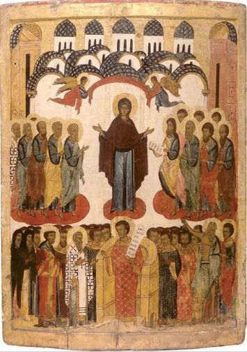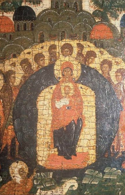 В другой форме сказались перемены в иконе «Покров» (Галерея Палаццо Монтанари, Виченца, илл. 522). Ее схема – новгородская: пятиглавый храм, четкие регистры и группы, ангелы поднимают над Богоматерью красную ткань. Композиция стала, пожалуй, даже более плотной, чем раньше, поскольку количество персонажей увеличилось (в соответствии с московской версией), а пропорции фигур остались по-новгородски крупными, тяжелыми. Вверху, по обеим сторонам Богоматери, представлены апостолы, а также Иоанн Предтеча и один епископ (св. Николай?). Внизу появилась фигура Романа Сладкопевца на амвоне, и, кроме императора и патриарха, также группы святых – мучеников и преподобных. Самым важным новым качеством «Покрова» является живопись ликов – тонких, с мелкими чертами, с полуприкрытыми, как в дионисиевских произведениях, глазами.