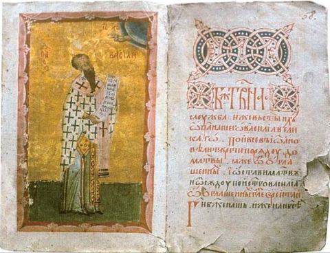 528. Миниатюра с Василием Великим и начальный лист текста Литургии. Из Гостинопольского Служебника. Около 1475 г. РНБ, Соф. 531