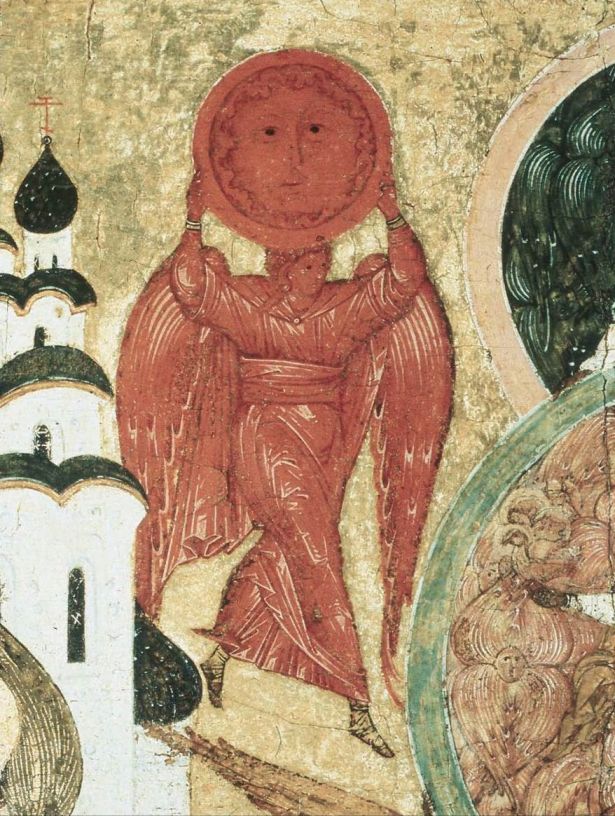 Присущее православию понимание Страшного Суда не столько как грядущей кары, сколько как шага на пути к вечному блаженству, как рубежа, к которому надо подойти со смирением, молитвой и нравственным очищением, нашло самое полное выражение в росписи 1408 г. Персонажи «Страшного Суда» наполнены светлой надеждой и тем особым настроением, где радость смешивается с печалью о грехах мира. Это состояние души называют непереводимым русским словом «умиление»; подобное настроение упоминают святоотеческие тексты как «радостнотворный плач» (то есть плач, приносящий радость). Лику одного из двух трубящих архангелов – на откосе западной арки, с трубой, опущенной вниз (илл. 413), придано особое просветленное выражение: кажется, что он скоро улыбнется.
