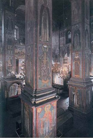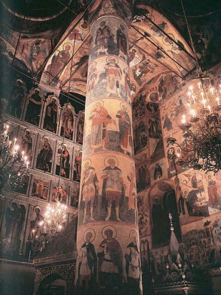 В солнечный день, когда яркие снопы света из южных окон наискось пронизывают интерьер Успенского собора, его стены, столбы и своды кажутся сделанными из расплавленного, тяжелого красноватого золота. Этот колорит на редкость сильно отличается от воздушно-голубых, с золотистым и белым, фресок Ферапонтова монастыря.