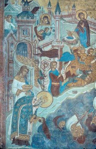 628. Погружение ризы Богородицы в море. Сцена из Акафиста Богоматери. Роспись Успенского собора Княгинина монастыря во Владимире. 1647–1648 гг.