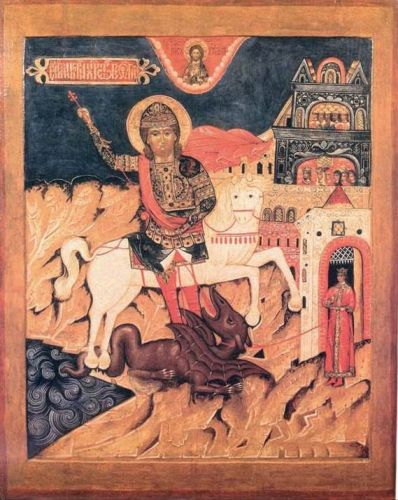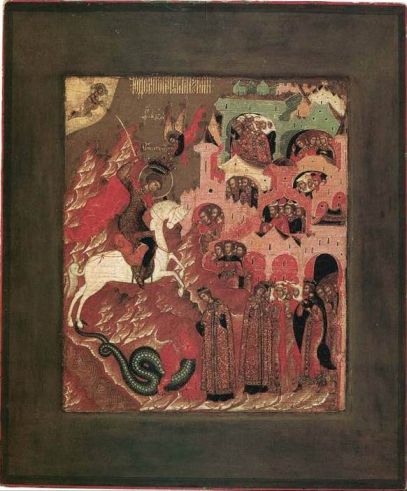 664. Чудо св. Георгия о змие. Конец XVII – начало XVIII в. Из села Юрьев-Наволок на Северной Двине. Архангельский музей изобразительных искусств