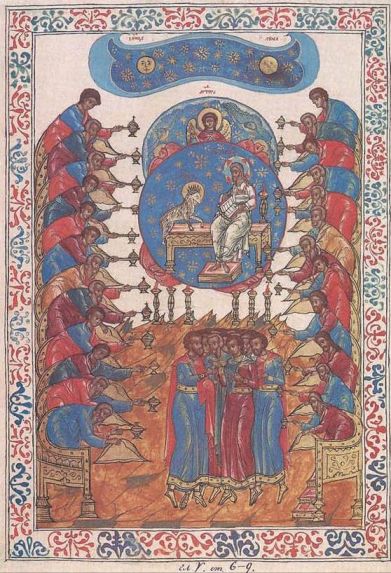 638. Агнец с Сидящим на престоле и 24 старца. Миниатюра Апокалипсиса, Откр.5:6–9. РГБ, ф. 173, Московская Духовная академия, № 14. Л. 38