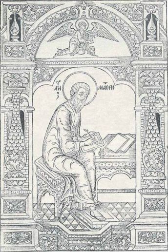 640. Евангелист Матфей. Гравюра старопечатного Евангелия. Мастер Кондратий Иванов. Москва, 1627 г.