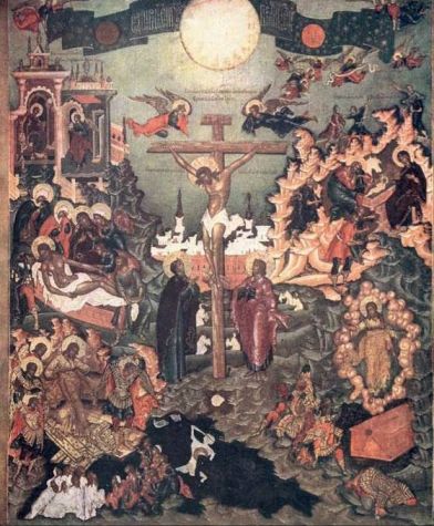 Другое произведение – икона «Единородный Сын» из церкви Св. Григория Неокесарийского на Полянке в Москве, около 1668 г., – поражает эмоциональностью (илл. 643). Центр композиции, с изображением Распятия, резко выделен пространственными цезурами и ирреальным светом, заливающим фигуру Спасителя. Четыре дополнительные сцены по сторонам центрального изображения выглядят словно кипящими из-за резких ракурсов, динамических поз, световых пятен. Взволнованность, подвижность, скольжение света, скругленность форм, носящих уже не плоскостной, а барельефный характер, становятся важнейшими и почти постоянными качествами русской средневековой живописи на ее завершающей фазе.