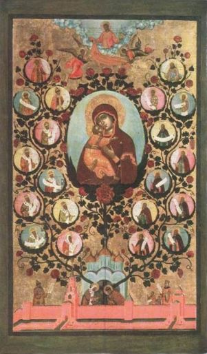 Древо, произрастающее из Кремля и Успенского собора, расходится на две симметричные ветви, поднимающиеся по сторонам «Богоматери Владимирской». Округлые завитки ветвей образуют медальоны, внутри которых представлены персонажи русской истории. Слева, снизу вверх, это четыре митрополита, два патриарха, цари Федор Иоаннович (последний из Рюриковичей), Михаил Федорович (первый из Романовых) и, наконец, царевич Димитрий, невинно убиенный ребенок, безгрешный молитвенник на небесах за Россию. Справа – преподобные и юродивые: князь-инок Александр Невский, прославленные московские игумены Сергий Радонежский с другими преподобными и трое блаженных. Изображенные держат свитки с текстами, прославляющими Богородицу.