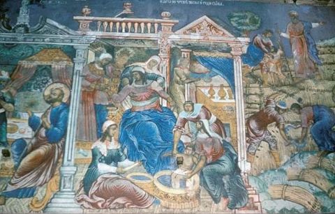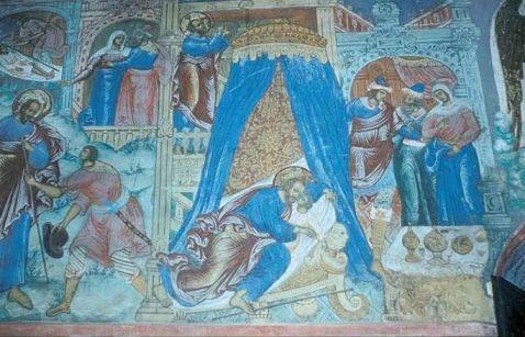 652. Сцены из цикла чудес пророка Елисея. Роспись церкви Ильи Пророка в Ярославле. 1680–1681 гг. Рождение сына сонамитянки