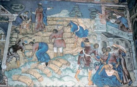 Среди промежуточных композиций, соединяющих узловые сцены, помещена сцена жатвы, согласно библейскому тексту (отрок, заболев, пошел к своему отцу, который был со жнецами). Эта сцена (ее часто трактовали как свидетельство «реализма» русской средневековой живописи») раскрывает поэзию предопределенных людям повседневных занятий и является цитатой из распространенных во всем средневековье сцен годового календаря, где уборка урожая обычно изображалась как аллегория одного из месяцев – июля или августа.