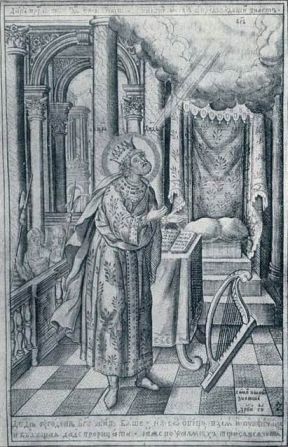 665. Царь Давид. Фронтиспис к Псалтири в стихах, Симеона Полоцкого. Москва, 1681 г. Гравюра Афанасия Трухменского по рисунку Симона Ушакова