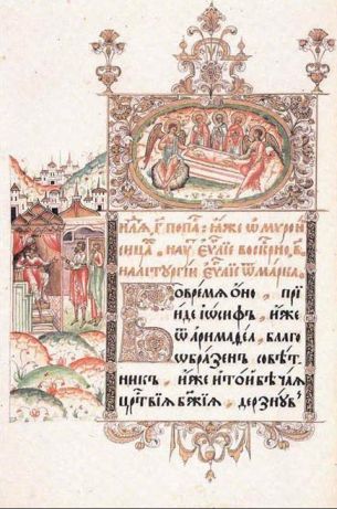 Рукописные книги XVII в. украшались миниатюрами лишь в тех случаях, когда содержание рукописи было редким, уникальным, либо, если это была обычная богослужебная книга, – в случае специального заказа и особого предназначения. Так, в 1693 г. для богатого Сийского монастыря на Севере была исполнена огромная книга Евангелия (Евангельских чтений) на 940 листах, где содержится около 9000 миниатюр: изображения евангелистов и их символов, евангельские сцены, а также аллегории месяце, в виде сцен, отвечающих тому или иному сезону (хранится в Санкт-Петербурге в БАН). Миниатюры и орнамент этой рукописи исполнены с большой роскошью, с обильным использованием золота (илл. 667).