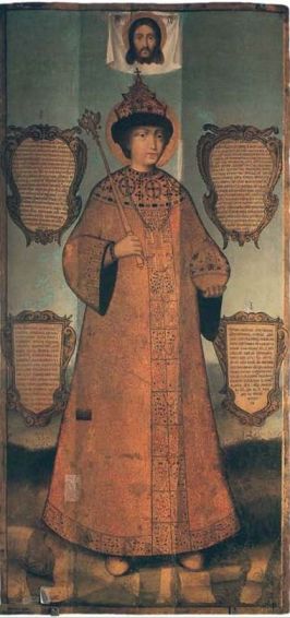 Развитие типа дает большой полнофигурный портрет царя Федора Алексеевича (ум. в 1682 г.), сына Алексея Михайловича и старшего (сводного) брата будущего царя Петра. Портрет был исполнен посмертно, в 1686 г. (ГИМ) (илл. 669). Это портрет-апофеоз: юный царь представлен в царском венце, со скипетром и державой, над его головой – Св. Убрус, а в четырех картушах по сторонам – тексты с его жизнеописанием. Новые качества этого портрета – намек на пространственную среду в композиции, а также верно схваченные фамильные черты первых Романовых, круглое коротконосое лицо.