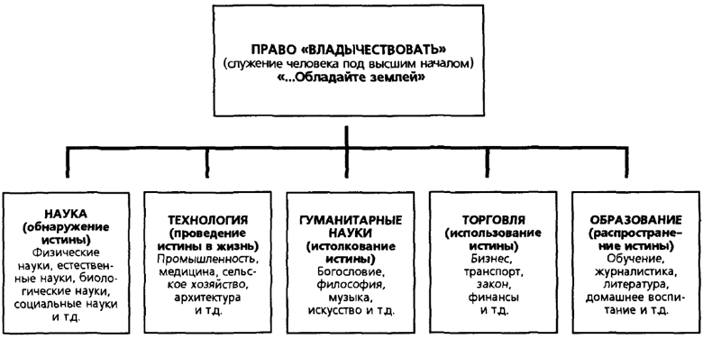 «Обладать землей» – не просто захватить ее, как, например, в войне. Это значит привести все земные системы и процессы в состояние оптимальной продуктивности и полезности – во славу Господу и во благо человечеству. Таким образом, первый завет дает человеку право (а фактически обязывает) заниматься тем, что мы сейчас называем наукой и техникой, побуждает к исследованиям и прогрессу. Сначала мы должны научиться понимать природу земных процессов, а затем использовать их в полезных и прекрасных системах и изделиях (см. рис. 3).