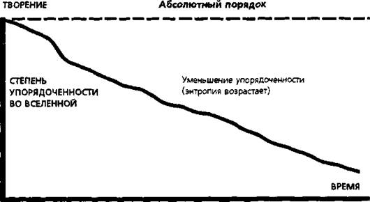 Ясное библейское свидетельство о частном, преднамеренном, завершенном и сохраняемом сотворении космоса весьма недвусмысленно поддерживают два великих закона термодинамики – два самых надежных обобщения, распространяющиеся на Вселенную. Эти законы универсальны, если универсальные законы вообще существуют. Нам неизвестно ни одного исключения из них. Первый, универсальный закон сохранения, мы только что обсудили. Второй, называемый иногда «стрелой времени», является универсальным законом распада, мы обсудим его позднее.