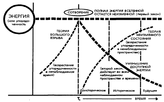 Во втором случае материя и энергия космоса каким-то неизвестным способом обрели существование и приняли сложную форму в первоначальном разрыве времени. Это провозглашает еще более знаменитая теория большого взрыва, в соответствии с которой материя, энергия и упорядоченность космоса возникли в течение очень короткого периода ненаблюдаемого времени, непосредственно перед установлением существующего порядка вещей, который подчиняется законам термодинамики.