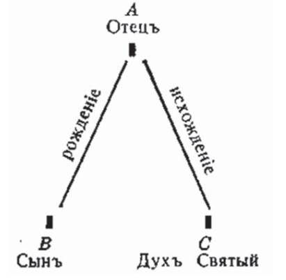 Пусть самый фактор будет обозначен через «А»; действия (энергии) же его, проистекающие одновременно: – одно в отношении «В», другое, различное от него – в отношении «С». Я утверждаю, что и «С» будет различным от «В». Ибо если бы оно было тем же, что и то, оно полностью соответствовало бы ему и тогда действие в отношении его, соответствовало бы действию в отношении «В», иными словами, было бы тем, что и то. Пусть под «А» будет обозначаться Отец, присносущно и по естеству действующий; под «В» – Сын; а под «С» – Дух святый; и действия, проистекающие от Отца – различны между собою: в отношении «В» это – рождение Сына; в отношении же «С» это – исхождение Божественного Духа. Следовательно, Дух – различен от Сына, так как в отношении бытия Каждого из Них различными являются действия; и уже не будет нам нужды в ином различии между Сыном и Духом, когда самые различные действия и происхождения довлеют для того, чтобы сделать различие между Ними.