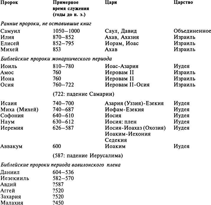 Остальная часть Ветхого Завета представлена пророческими книгами, расположенными не в хронологическом порядке. Приведенная ниже таблица дает общее представление о предполагаемых датах жизни пророков, которые нам следует знать при чтении этих книг.