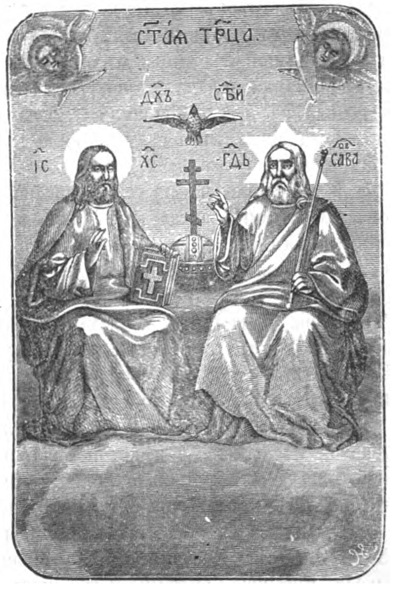 Дабы ревнующие о служении Единому, Истинному, Невидимому и Всесвятому Богу и не утвержденные в вере души (2Пет.2:14), читая или слыша прещения и угрозы Слова Божия на чтителей ложных божеств или идолов, не разумея Писания, ни силы Божией, не смущались духом при виде священных изображений Бога небесного и прельщаемые лживым учением людей, вносящих пагубные ереси (2Пет.2:1), не изменили истину Божию во лжу, т.е. отрицаясь идолов, не дерзнули наряду с ними отвергнуть и священные образы небесного, мы в сопоставление с изображениями священными предлагаем также и рисунок, изображающий ложных богов или идолов современного языческого культа буддийского, как образчик тех идолов, которые возбраняются второю заповедью десятословия и осуждаются во многих местах Св. Писания под различными наименованиями: кумиров, подобий, «истуканов, изваянных и слиянных, богов чуждых, языческих, рукотворенных, суетных и мерзостей, как богопротивное измышление извращенного грехом ума человеческого (Исх.21; Лев.26:30; Втор.4:19–20; Пс.113:12–17; 134:15–19; Прем.13:10–19; 15:15–19; Ис.44:12–18; Иез.8:9–10; Деян.17:89; Рим.1:22–23). Языческие идолы, представленные на нашей картине, дают наглядно уразуметь каждому настоящий смысл изречения апостольского: идол в мiре ничто (1Кор.8:4)., т.е. идолы суть ничтожества (суетное-пустое), так как представляют искаженный образ таких предметов, которых в действительности, в мiре живых существ нигде нет, никогда не было и быть не может, что они – вымышленное, по большей части нелепое, уродливое создание извращенного страстями воображения человеческого, плод сонных грез больного. Иной, напр., идол из упоминаемых в библии представляет половину человека и половину рыбы (Дагон Флистимский), другой – фигуру человека, с головою вола (Ваал Финикийский), или женщину с коровьей головою, украшенной огромными рогами (Астарта), или тело женщины с крыльями коршуна (Изида); медного вола с протянутыми руками человека, требующего кровавой человеч. жертвы (Молох), человека с головою птицы – ястреба или ибиса, с головою зверя – шакала, барана, львицы, кошки, крокодила. Словом – не оставалось ничего из предметов видимого мiра, – начиная от величественного светила солнца до ничтожного жука, – которые бы в измененном фантазией человеческою виде не изображались в храмах и не почитались в качестве богов. И подобными изображениями были переполнены египетские языческие храмы. Имеющиеся на нашем рисунке чудовищные изображения богов буддийского культа по своей уродливости и крайнему безобразию напоминают ту группу древних (библейских) терафимов (домашние идолы), которые своим чудовищным безобразием имели в виду приводить в ужас злых демонов, и тем (по суеверному понятию) охранять от них жилища людей. По существующим описаниям, фигура такого божества (олицетворяющего страх) представляет из себя туловище собаки с ногами орла, с руками, снабженными лапами, головою, наполовину обнаженною до костей и украшенной огромными рогами козла и проч. (Смотри описание фигуры, хранящ. в Лувр. музее Библ. истор. В.З. Фаррара т. Ι, стр. 376).