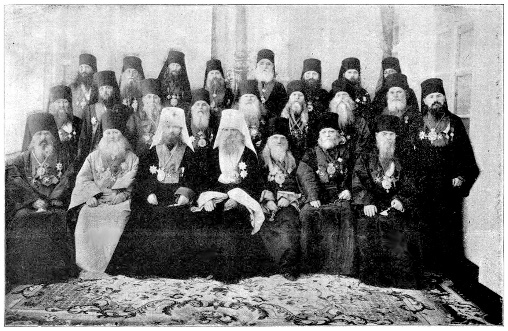 На помещённой ниже группе иерархов изображены слева в первом ряду (сидящие) 1) Владимир, Еп. Нижегородский, 2) Иустин, Архиепископ Херсонский, 3) Владимир, Митрополит Московский, 4) Иоанникий, Митрополит Киевский, 5) Модест, Архиепископ Волынский, 6) Димитрий, Архиепископ Тверской, 7) Анастасий, Еп. Воронежский. Во втором ряду (слева же) 1) Иоанникий,Еп. Архангельский, 2) Пётр, Еп. Смоленский, 3) Сильвестр, Еп. Каневский, первый викарий Киевской митрополии, б. ректор Киевск. академии, 4) Ириней Еп. Подольский (Орда) 5) Мисаил, Еп. Могилевский, 6) Гурий, Еп. Самарский, 7) Иаков, Еп. Кишинёвский, 8) Иоанн, Еп. Саратовский, 9) Питирим, Еп. Тульский. В третьем ряду (слева же) 1) Михаил, Еп. Ковенский, 2) Иоанникий. Еп. Углицкий, викарий Ярославской епархии, 3) Борис, Еп. Ямбургский, ректор С.-Петербургской академии, 4) Сергий, Еп. Уманский, второй викарий Киевской митрополии, 6) Димитрий, (Ковальницкий) Еп. Чигиринский, ректор Киевской академии, 7) Антоний, (Храповицкий) Еп. Чистопольский, ректор Казанской академии. 7) Серафим, Еп. Острожский, викарий Волынской епархии 8) Кирион, Еп. Алавердский, викарий Грузинского экзархата.