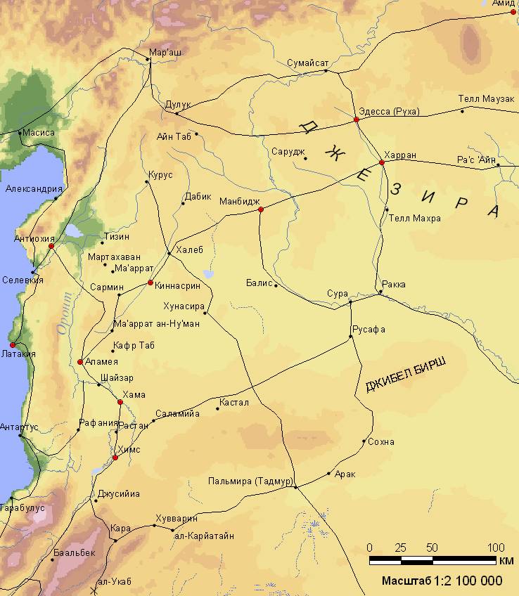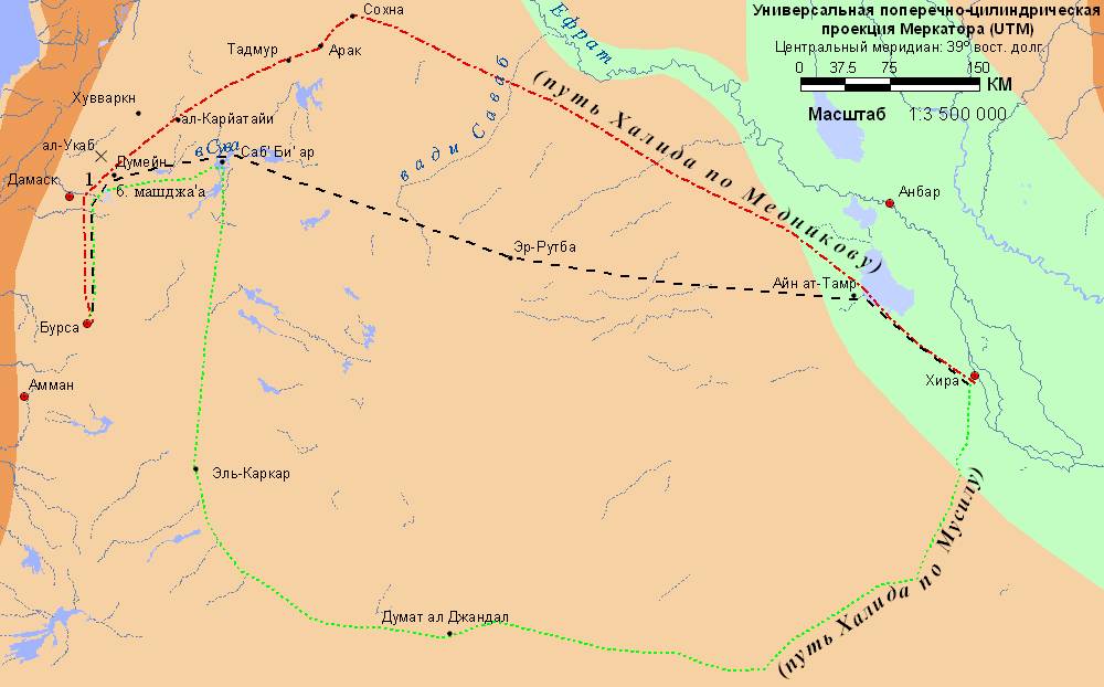 К сожалению, мы не знаем, где лежал этот гибельный участок пути, и не можем безоговорочно определить тот пункт, к которому так спешил выйти Халид. Если отбросить явно ошибочно отнесенные к этому походу Анбар и ал-Хусайд, то останутся два варианта маршрута. Согласно одной версии, Халид, миновав безводный участок пути, вышел к Сохне, заключил договор с ее жителями, прошел через Арак и завоевал Тадмур, а затем (упоминаются еще ал-Карйатайн и Хувварин) через Мардж ар-Рахит направился к Бусре. Придерживающийся этой версии Н. А. Медников прокладывает маршрут Халида по условно проведенной прямой от Айн ат-Тамра до Арака90. Этот путь топографически логичен, но вызывает сомнение, мог ли небольшой отряд, к тому же стремившийся достичь цели максимально скрытно, завоевать хорошо укрепленный в ту пору Тадмур91